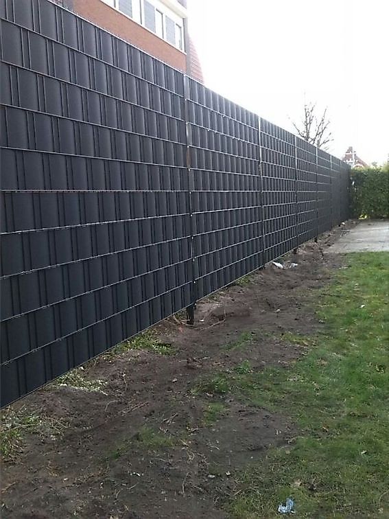 Bij dit type wordt er door de verticale staven kunststoffen panelen gevlochten zodat u als het ware een dichte “Schutting” krijgt. Vlechtwerk kan in beide varianten ingezet worden. Dus de staander tussen de dubbelstaafmatten maar ook achter de dubbelstaafmatten gemonteerd.